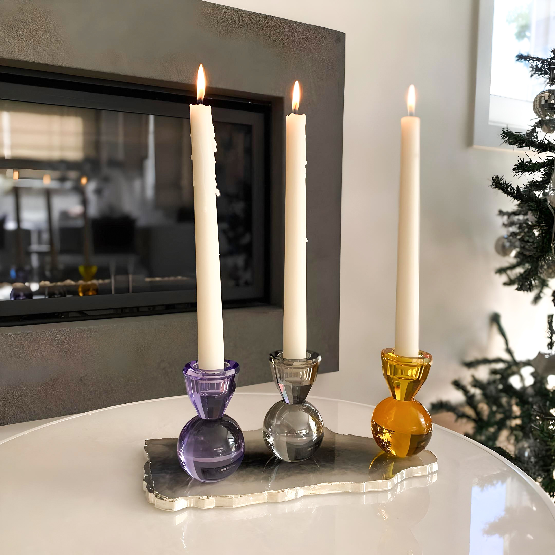SPARKLE Şamdanlar, özel kesim cam kullanılarak el işçiliğiyle üretilmiştir. Kesim işleminin ardından uygulanan özel boyama tekniği sayesinde ışığı kırarak göz alıcı bir parlaklık ve renk geçişi oluşturur. Her renk seçeneği, modern ve zarif bir dekorasyon tamamlayıcısı olarak tekli veya kombinlenerek kullanılabilir. Masa dekorasyonundan raf düzenlemelerine kadar birçok alanda şıklık katmak için idealdir. % 100 el yapımıdır.