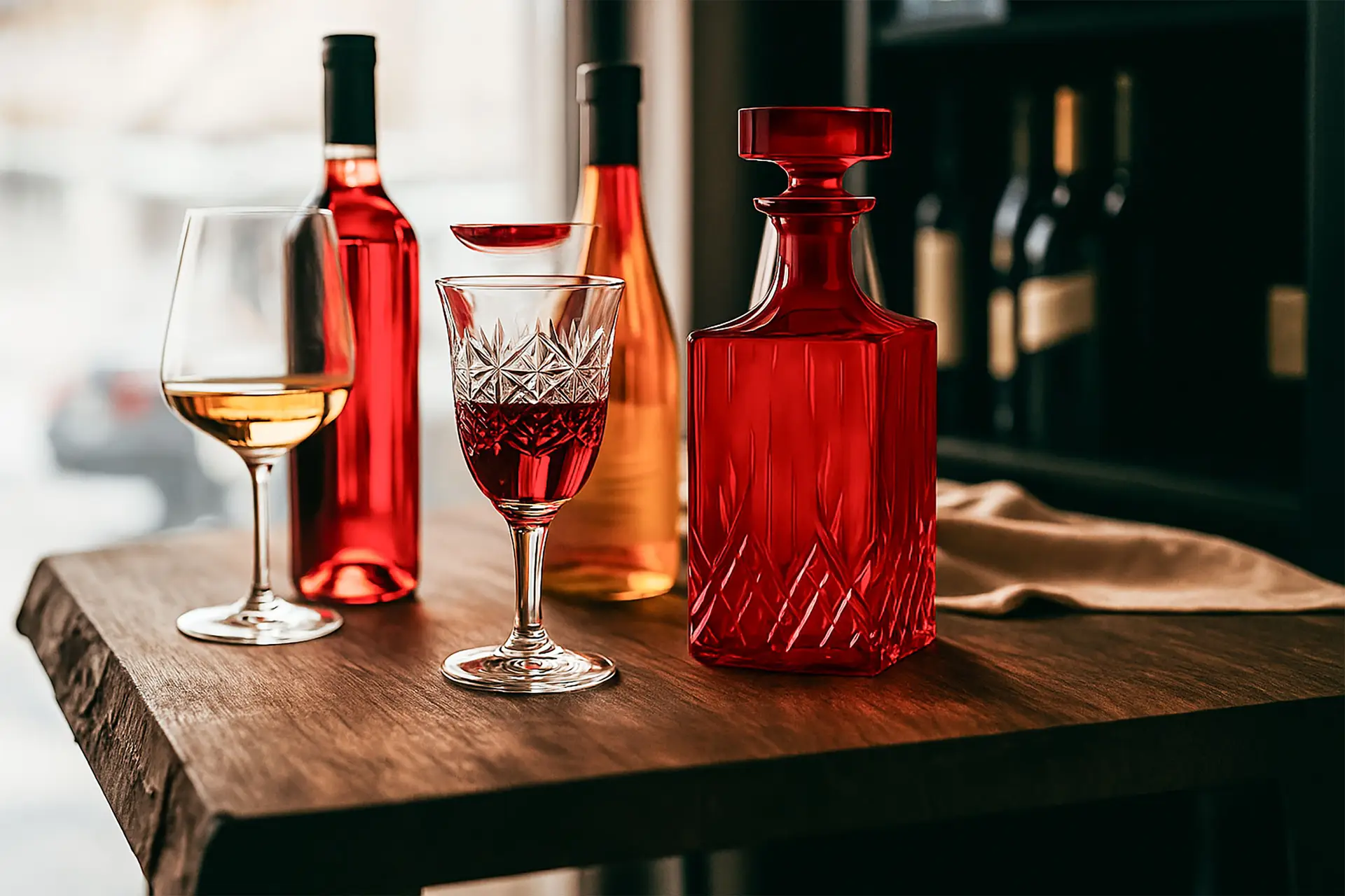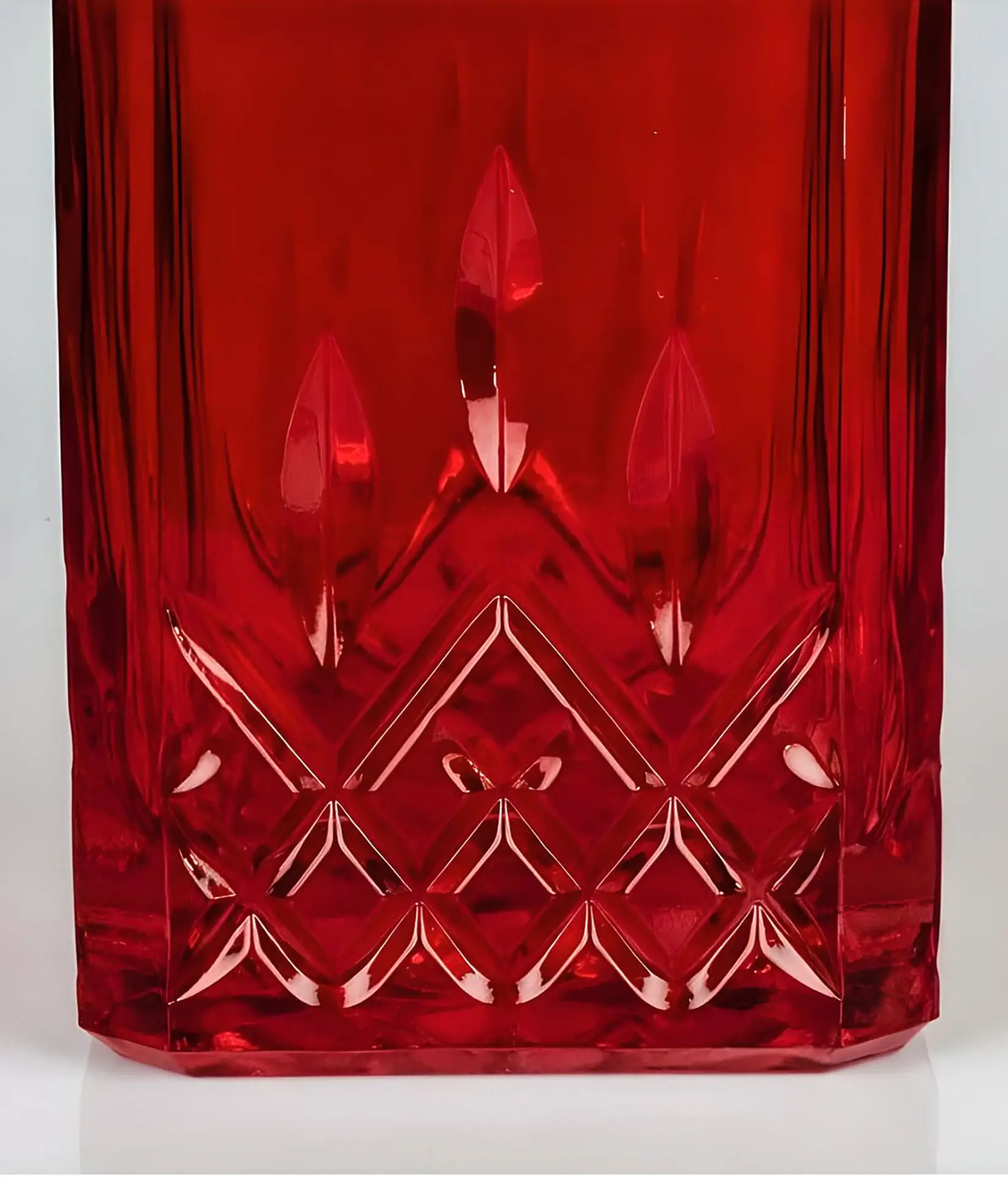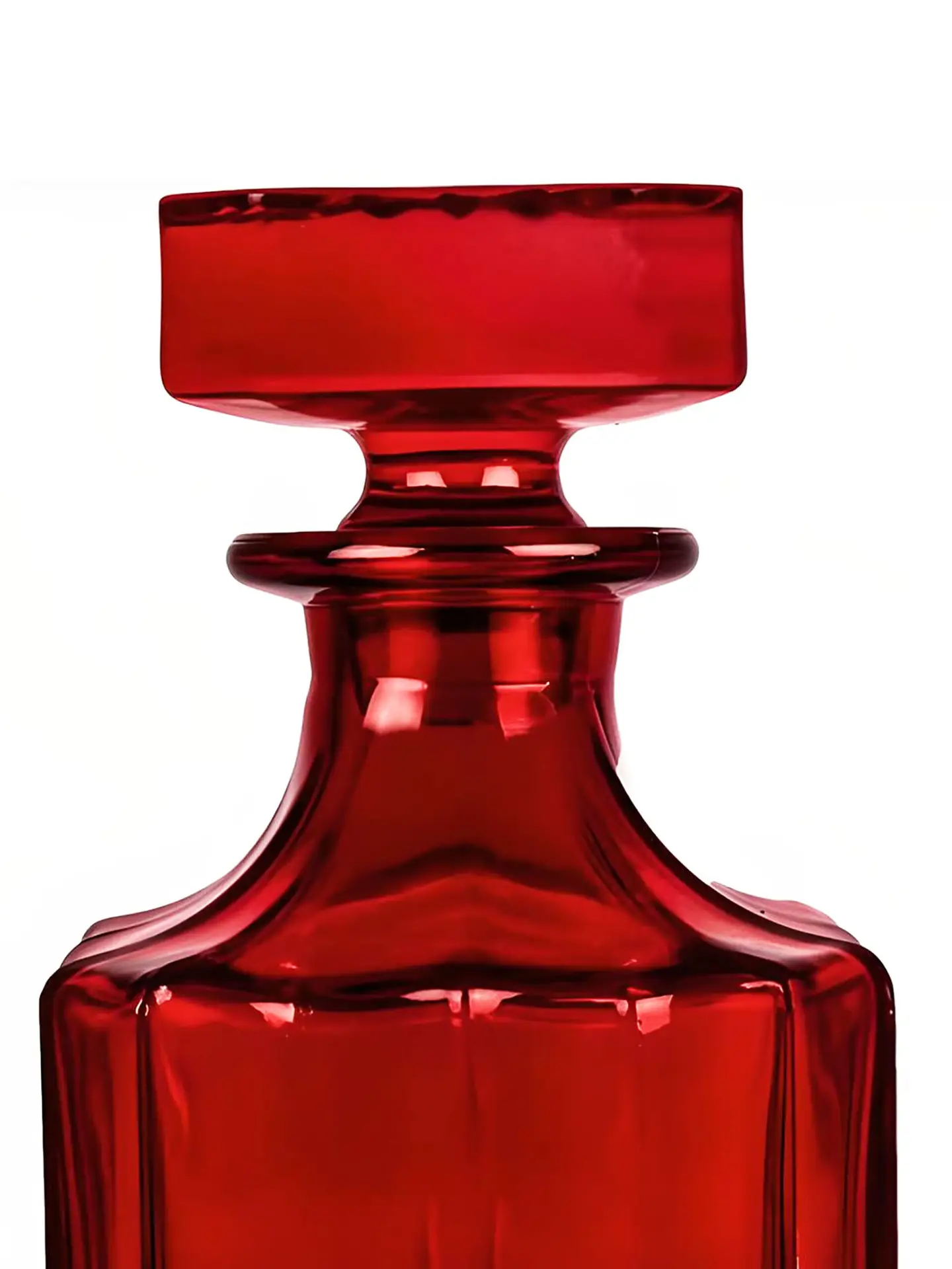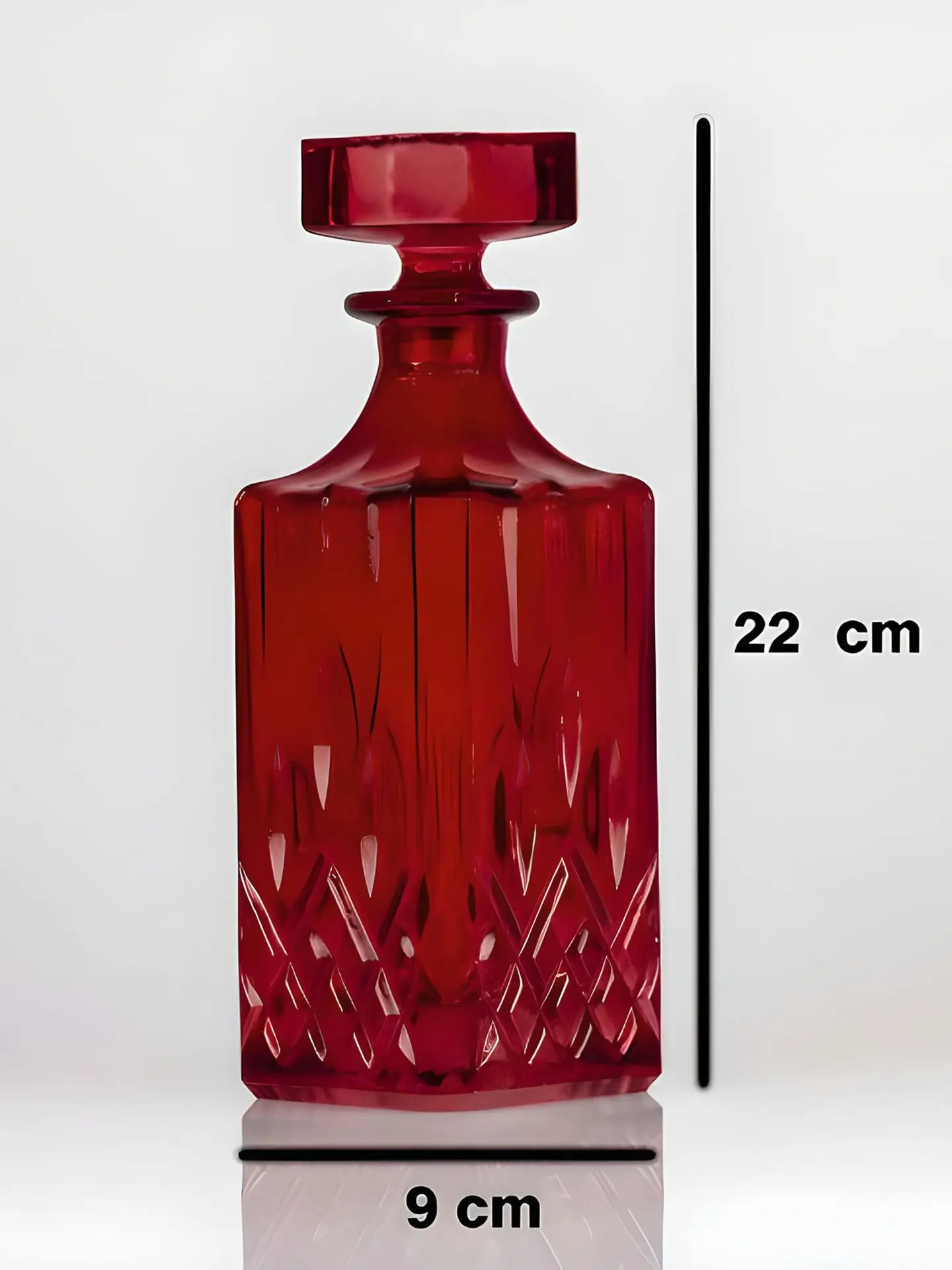 Sadece dekoratif amaçla kullanılmak üzere tasarlanmıştır; içine sıvı, içki veya parfüm koyulmaz. Kırmızı tonlarıyla mekâna zarif bir ışıltı katan bu cam obje, vitrin, konsol veya bar ünitesi üzerinde lüks bir atmosfer oluşturur.