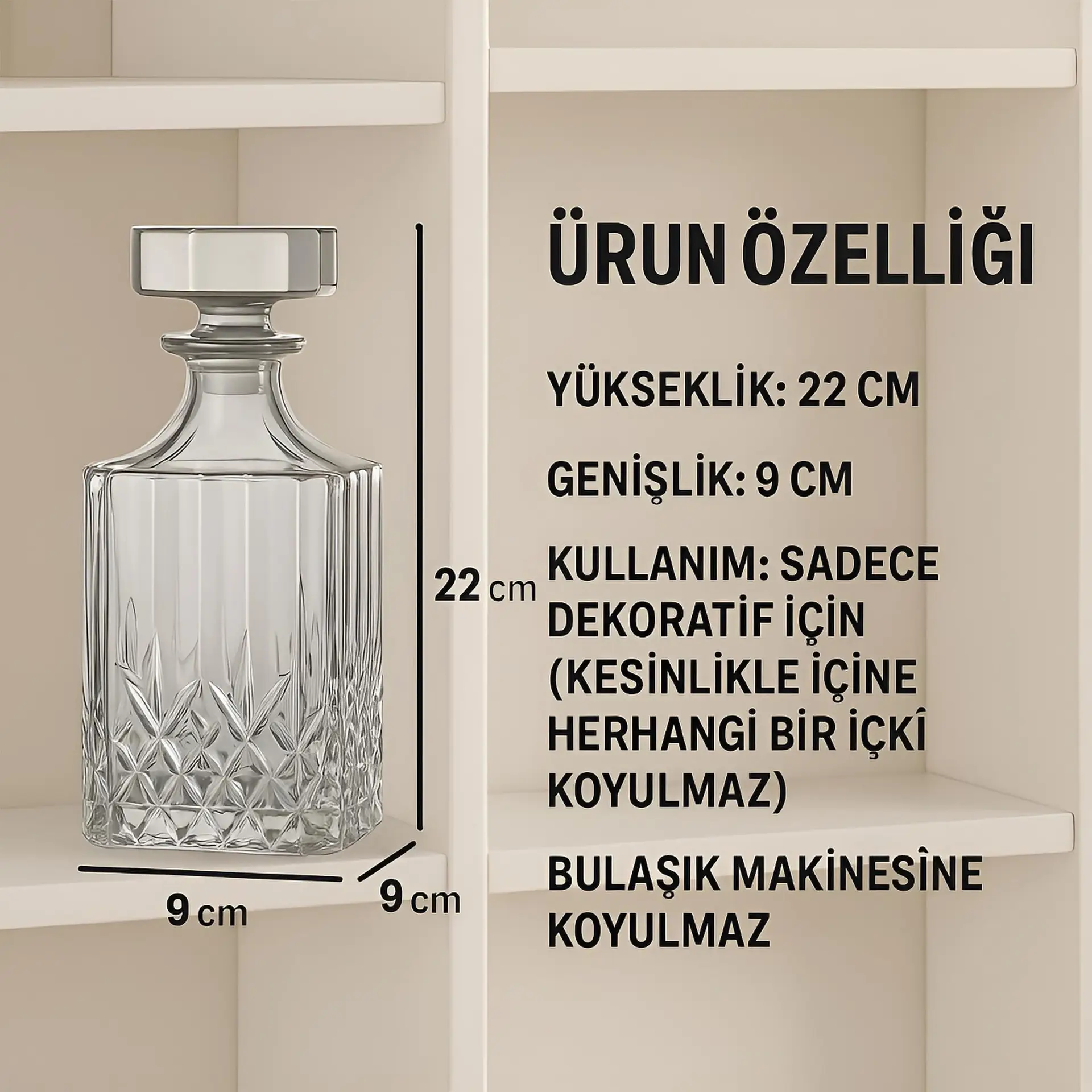 Sadece dekoratif amaçla kullanılmak üzere tasarlanmıştır; içine sıvı, içki veya parfüm koyulmaz.Bu zarif şampanya (bal rengi) kristal dekoratif şişe, el işçiliğiyle üretilmiş özel bir cam objedir.