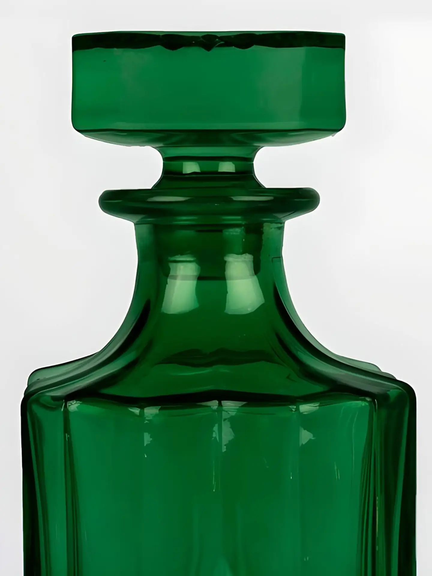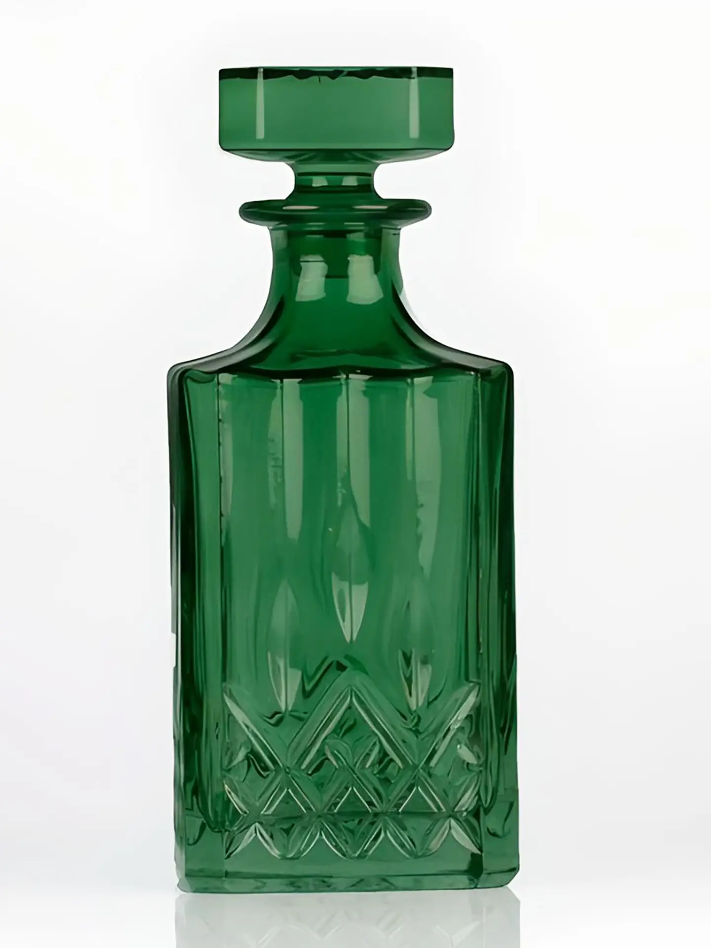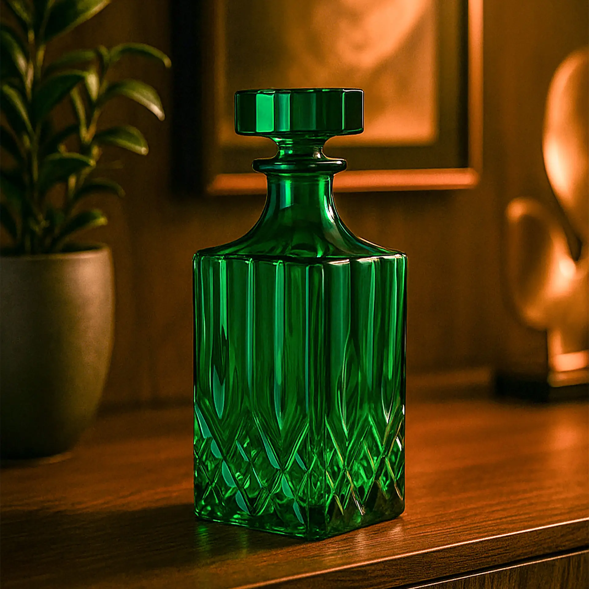Bu zarif yeşil kristal dekoratif şişe, el işçiliğiyle üretilmiş özel bir cam objedir.