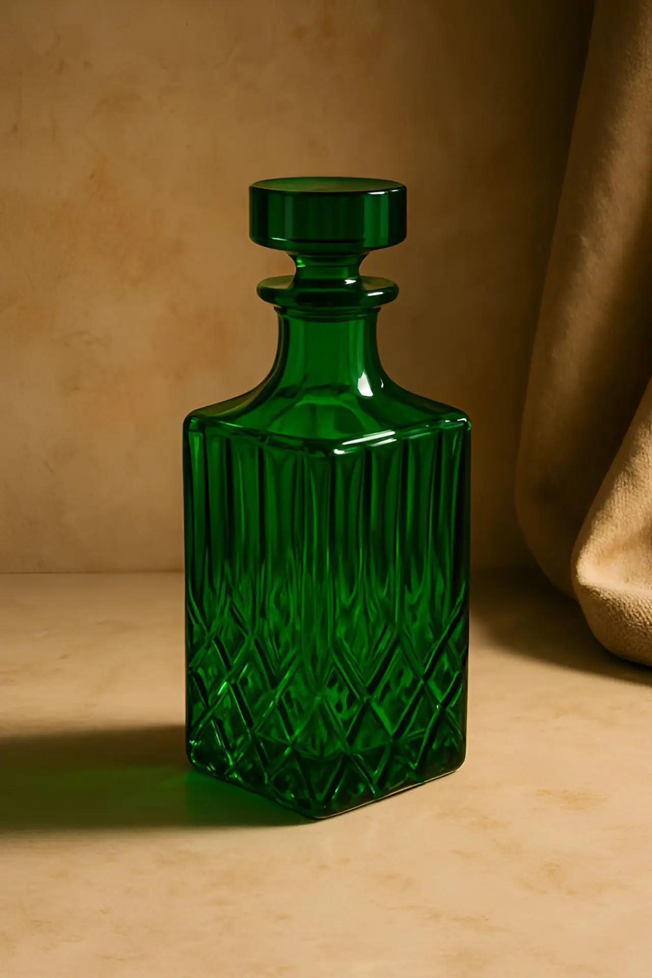 Sadece dekoratif amaçla kullanılmak üzere tasarlanmıştır; içine sıvı, içki veya parfüm koyulmaz. Yeşil tonlarıyla mekâna zarif bir ışıltı katan bu cam obje, vitrin, konsol veya bar ünitesi üzerinde lüks bir atmosfer oluşturur.